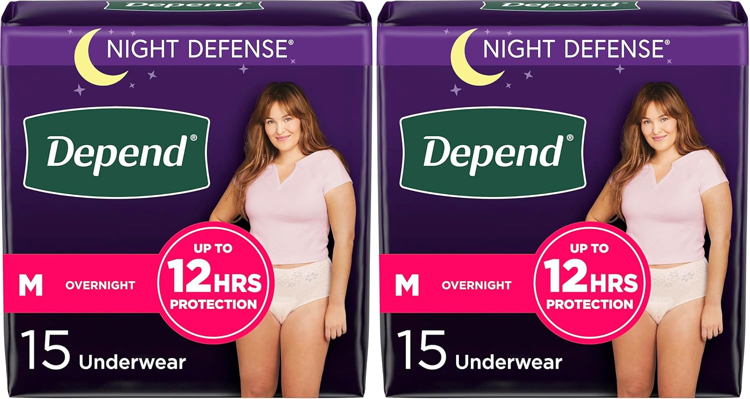 Sleep through the night with Depend Night Defense Incontinence Underwear for Women with Overnight Absorbency, providing up to 12 hours of protection. Available in a beautiful blush color, our adult diapers for women are ideal for incontinence, postpartum bladder leaks, and nighttime use. Our adult diapers for women features a super absorbent core that absorbs 30x its weight* and OdorBlock technology. Depend underwear wicks wetness away. Depend Night Defense incontinence and postpartum underwear for bladder leaks is available in five sizes: small (24–30" waist), size medium (31–37" waist), size large (38–44" waist), size extra-large (45–54" waist) and size extra-extra-large (55–64" waist). Packaging may vary from images shown. (*super absorbent material absorbs 30x its weight)