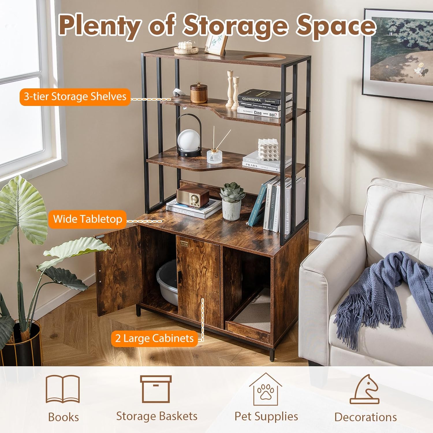 DescriptionThe large enclosed cabinet with air vents will reduce litter tracking and odors, while offering a perfect spot for your beloved feline friends to enjoy their privacy. With a side entry, cats can easily enter their secrete shelter. Also, there is a scratching pad to satisfy cats' scratching instinct. With 3-tier storage shelves and a wide tabletop, the hidden cat washroom goes beyond just serving as a resting place for your cats. It offers ample storage space for all your cat essentials, keeping them organized and within easy reach. Moreover, there is a hole on the top shelf, which allows cats to jump up and down with ease. For excellent stability, the tall corner shelf boasts anti-tipping device and adjustable feet pads to prevent wobbling. SpecificationsColor: Rustic Brown + Black/White + GoldMaterial: MDF + MetalProduct Dimensions: 33.5" x 18" x 61"/ 85 x 45.5 x 154 cm (L x W x H)Cabinet Inner Dimension: 21" x 17.5" x 19.5"/ 53 x 45 x 49 cm (L x W x H)Scratcher Size: 16" x 8.5"/41 x 21.5 cm (L x W)Side Entry Size: 19" x 10"/48 x 25 cm (L x W)Net Weight: 69 lbs/31 kg