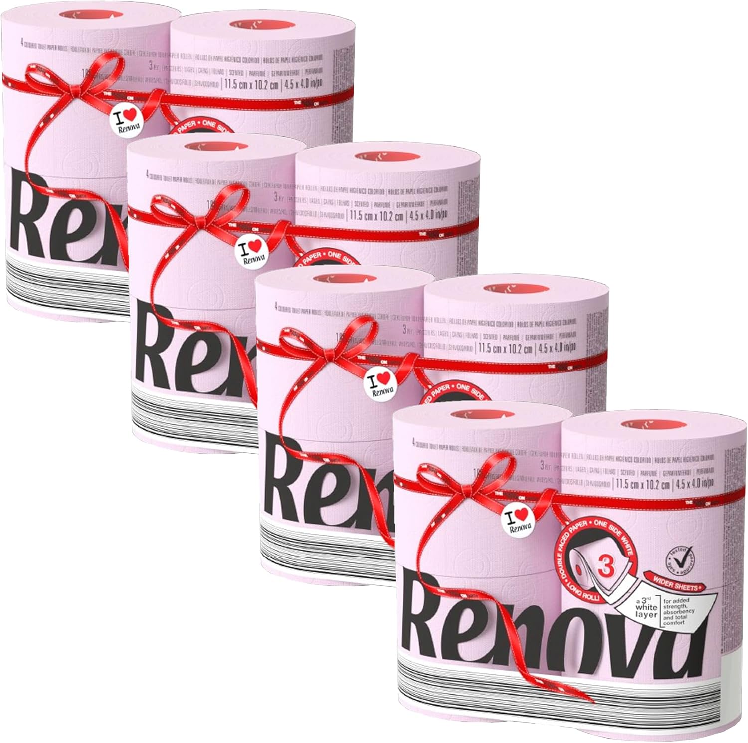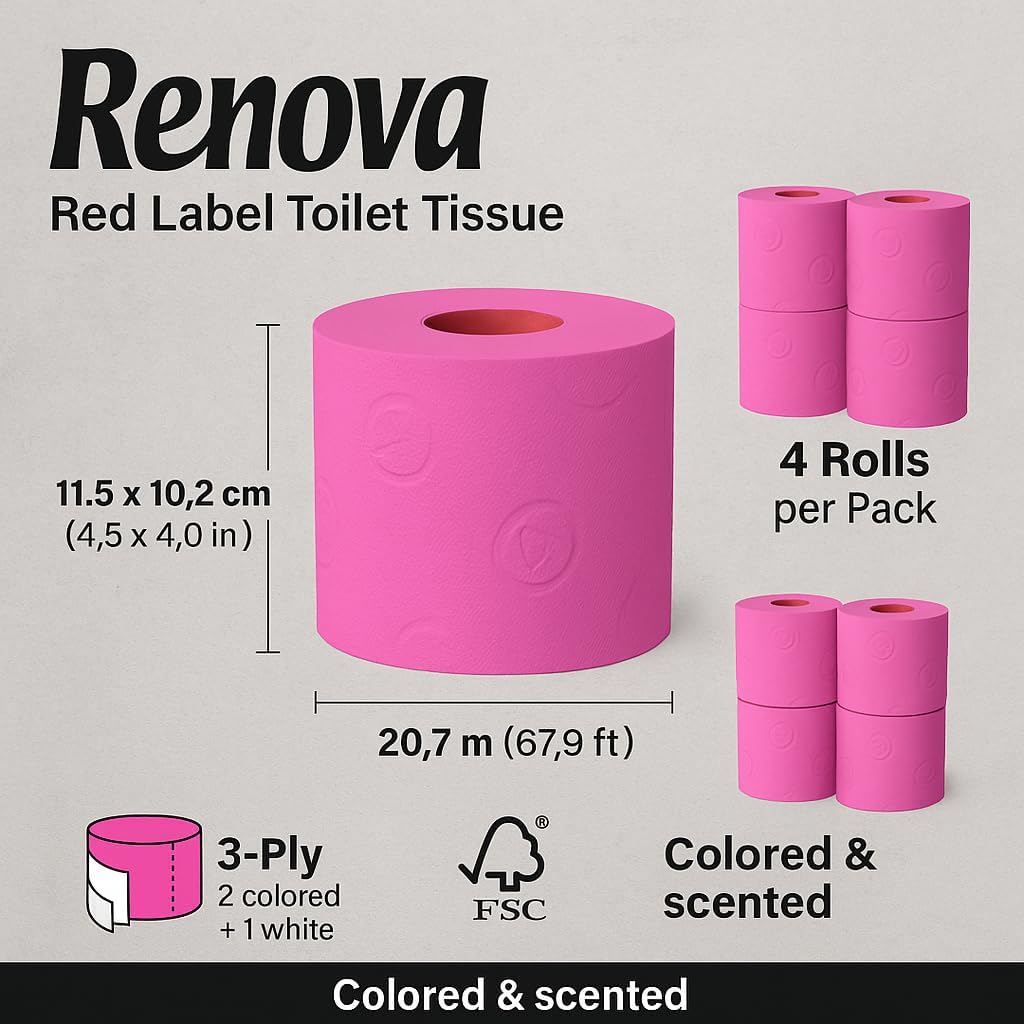 This Renova Colored Toilet Paper 3-Ply – 4 Rolls Set offers a bold and colorful twist on a daily essential. Designed to elevate your bathroom décor with vibrant hues and premium texture, this collection features 3-ply bathroom tissue with 180 sheets per roll. Each roll is crafted with an outer colored ply and white inner layers for a balanced look and comfortable feel. Dermatologically tested and made from FSC-certified materials, this toilet paper is safe for daily use and environmentally conscious. Available in a variety of unique shades including red, blue, fuchsia, lime green, vanilla, and light pink. Whether you're coordinating with a themed event, refreshing guest bathrooms, or adding a fun detail to everyday use, this Renova 4-roll set makes an ideal, functional, and stylish choice. Choose your color and transform your bathroom into a personalized space full of charm and character.