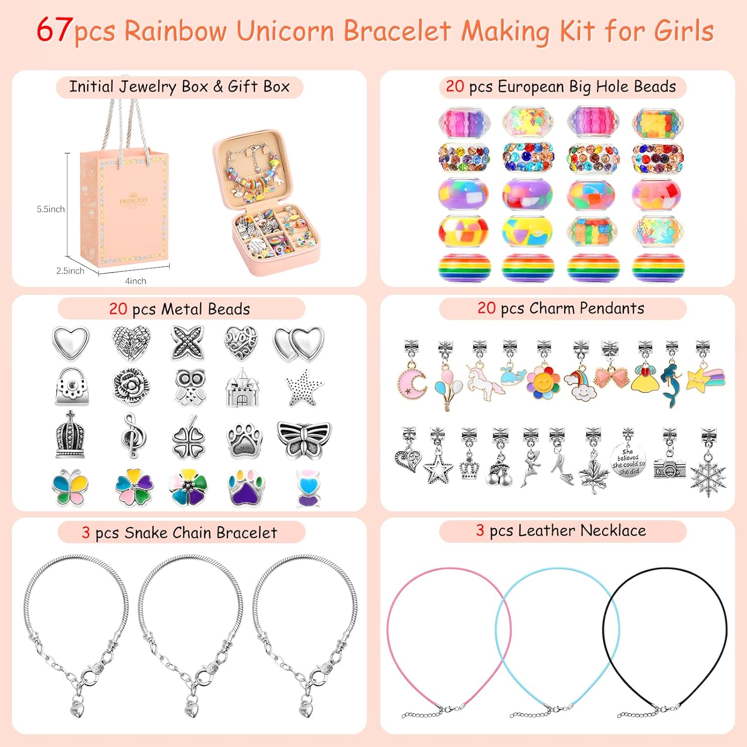 | Included Components | 1 pink jewelry organizer box, 66 pcs colorful jewelry accessories, 3 snake chain bracelets, 3 necklaces |