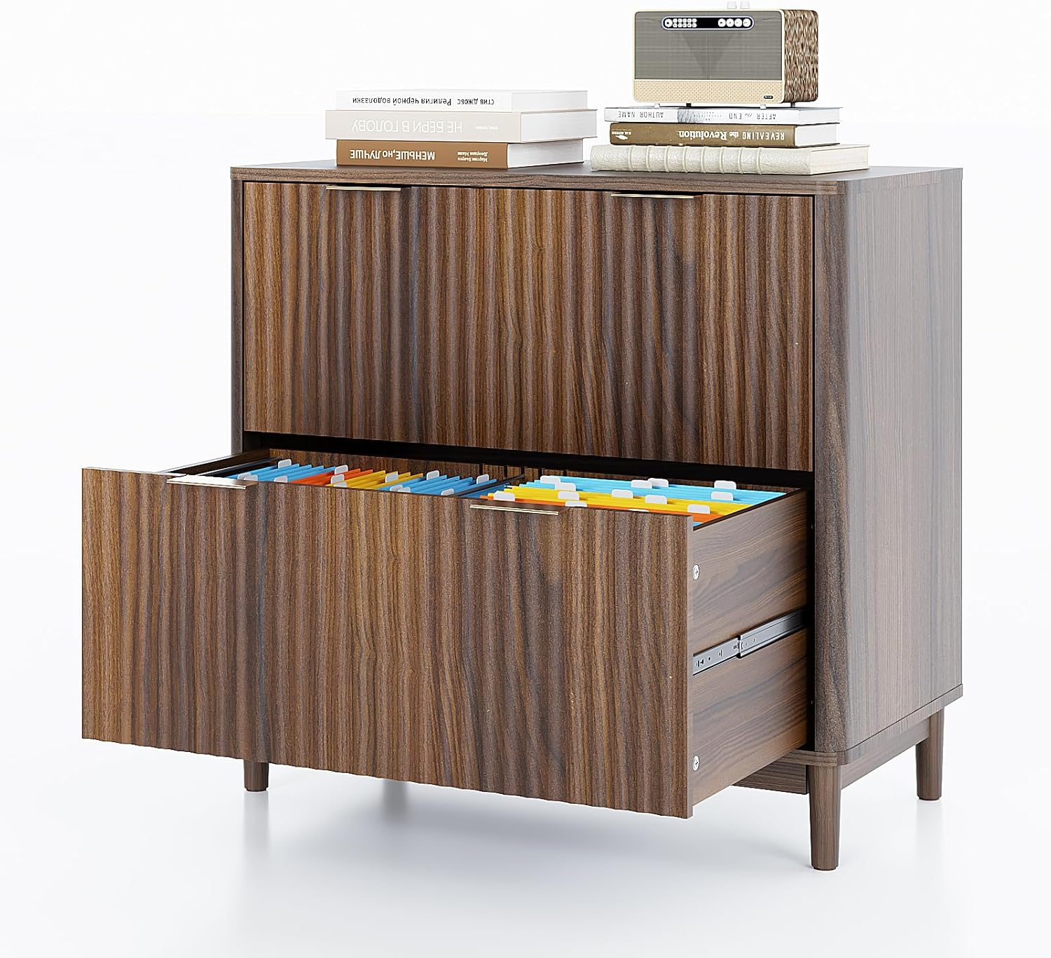 Introducing the VINGLI Oak Fluted Lateral 2-Drawer File Cabinet, a remarkable addition to your workspace or home.★This file cabinet is a masterpiece of modern design, featuring a distinctive wave-shaped fluted panel and a PVC-formed surface that exudes elegance and sophistication. It effortlessly blends with any interior style, adding a touch of class to your surroundings. ★The intelligent storage solution is a game-changer. With two spacious drawers, it accommodates Letter, Legal, and A4 size file hanging folders. You have four optional ways to store your folders, allowing for flexible space adjustment and providing ample storage space. ★Say goodbye to noisy drawers! The three-section silent slides guarantee that the drawers extend smoothly and silently, making it a breeze to search and access your folders. ★Crafted from high-quality wood and equipped with an anti-tipping kit, this cabinet ensures durability and enhanced safety. ★Its versatility makes it perfect for a wide range of settings. Whether it's a home office, a business environment, or for students, it serves multiple purposes. It can be used to hang folders or remove the rods for organizing items as a regular drawer. It also doubles perfectly as a printer stand. ★Assembly is a breeze with detailed step-by-step instructions and clearly labeled parts. If you encounter any installation problems, simply notify us, and our dedicated team will respond within 24 hours. Invest in the VINGLI Oak Fluted Lateral 2-Drawer File Cabinet and experience a seamless blend of style, functionality, and convenience.